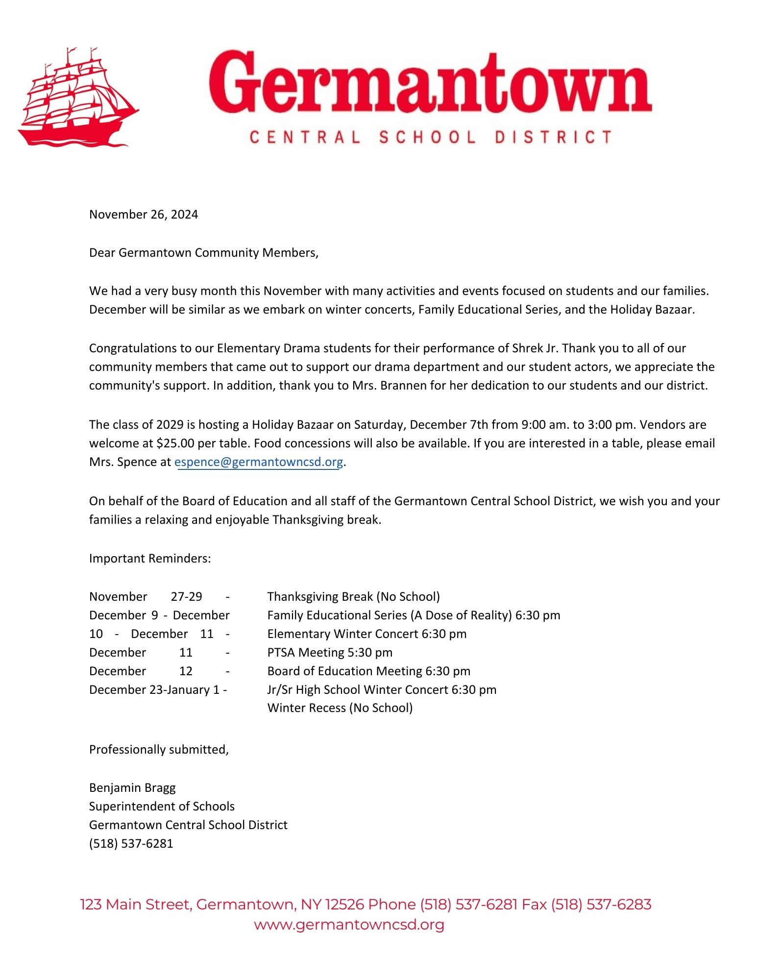 Superintendent Bragg's Monthly Newsletter